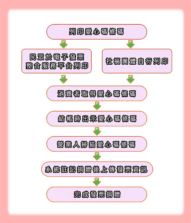 社福團體接受民眾捐贈發票,社福團體可發送屬於該團體之愛心碼予民眾,民眾亦可自行自該平台下載社福團體專屬愛心碼,於消費時出示社福團體之愛心碼予店家即可捐贈該張電子發票。